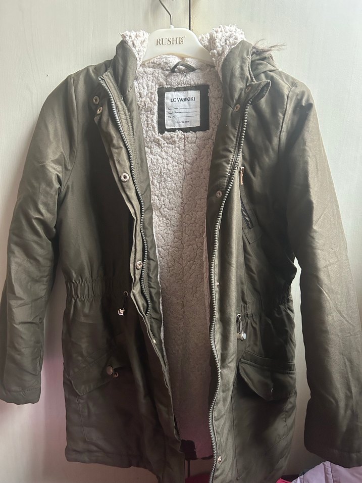 Gri süet kumaştan, düğmeli ve notched yaka detaylı. Bol kesim, uzun kollu ve içi yumuşak sıcak astarlıdır. RUSHE askıda durmaktadır.