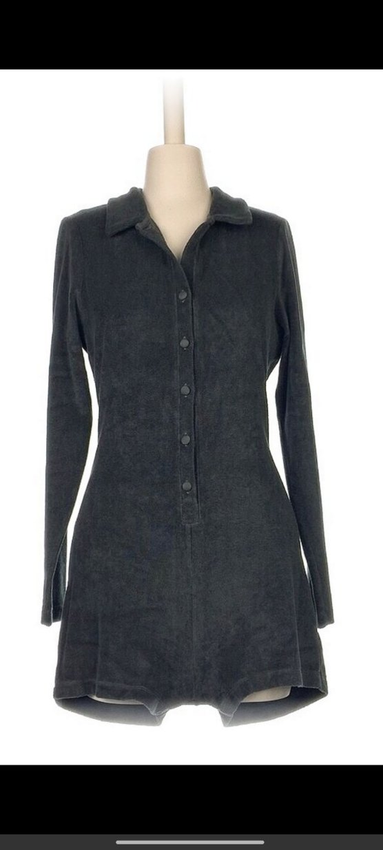Gri süet kumaştan yapılmış, düğmeli, yakalı ve uzun kollu şortlu tulum rahat ve bol kesimlidir. Günlük kullanıma uygundur. marka temsili