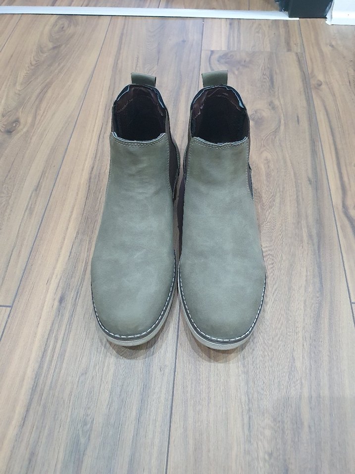Gri süet malzemeden yapılmış, tokalı ve desen içermeyen erkek botları. Modern sokak stiline uygun, günlük kullanıma elverişli.