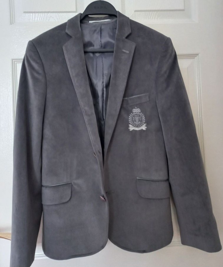 Gri süet kumaştan, düğmeli ve normal kesim erkek ceket. Uzun kollu, ofis şıklığı için uygun, göğüs cebinde işlemeli amblem bulunur.