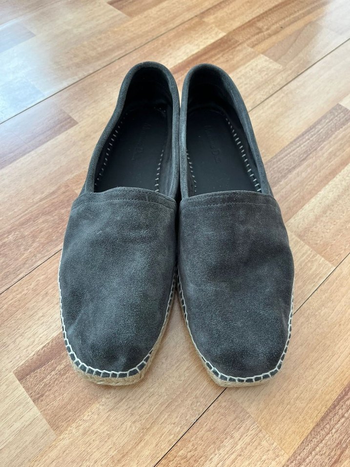 Gri süet malzemeden yapılmış, düz tabanlı espadril ayakkabılar. Minimalist ve zahmetsiz şıklık sunar, günlük kullanım için uygundur.