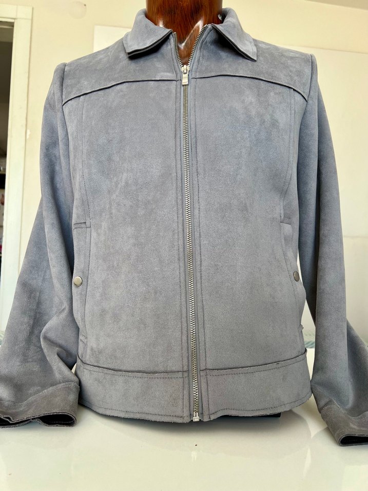 Gri süet malzemeden yapılmış, fermuarlı ve kesik yakalı erkek ceket. Uzun kollu ve rahat kesimli, gündelik sokak stili için uygundur.