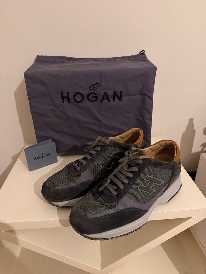 Gri süet malzemeden yapılmış Hogan marka erkek spor ayakkabısı, bağcıklı ve baskılı detaylara sahip, günlük sokak stili için uygun. ♂️