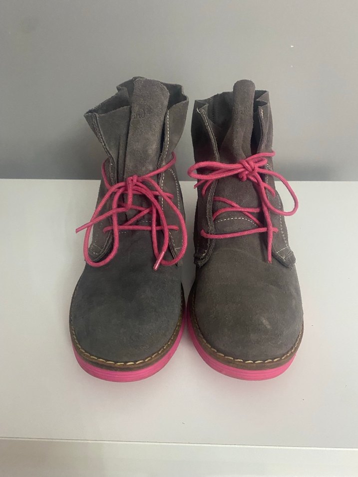 Gri süet kadın bot, pembe bağcık ve dolgu topuklu. Tokalı, gündelik sokak stiline uygun.yeni kullanılmadı