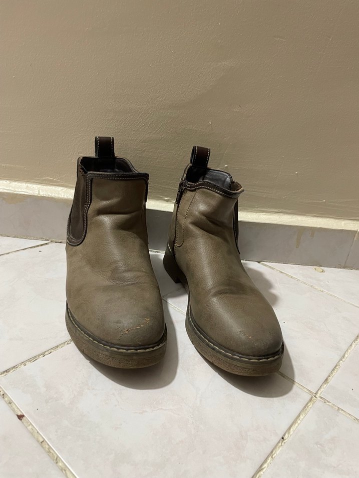 Gri süet kadın botları, tokalı ve topuklu. Minimalist, desen içermeyen tasarımıyla günlük sokak stiline uygun.