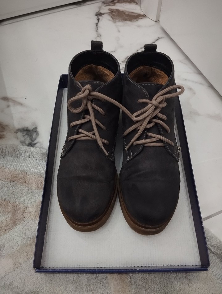 Gri süet malzemeden yapılmış, tokalı ve bağcıklı kadın botları. Minimalist ve normcore tarzıyla günlük kullanıma uygundur.