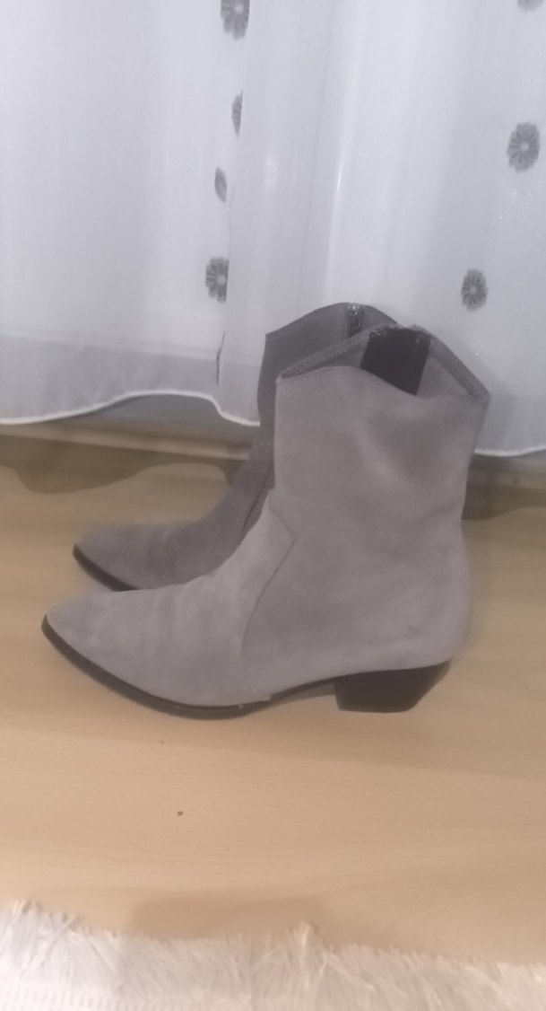 Gri süet kadın botları, blok topuklu ve desensiz tasarımıyla minimal ve zahmetsiz şıklık sunar. Günlük kullanıma uygundur. 38 numaradır hiç bir defosu yoktur acayip rahat bir ayakkabı topuğu 4-5 cm2. fotoda tam rengi var