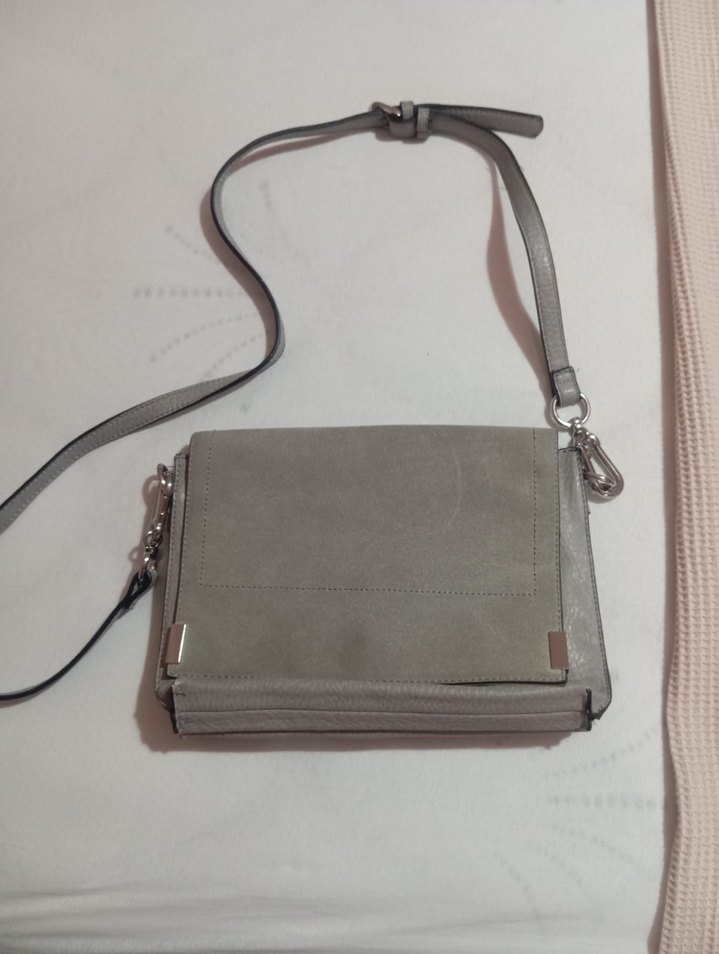 Gri süet kadın çanta, fermuarlı kapanış ve ayarlanabilir askıya sahiptir. Minimalist tasarımı günlük ve sokak modasına uygundur.