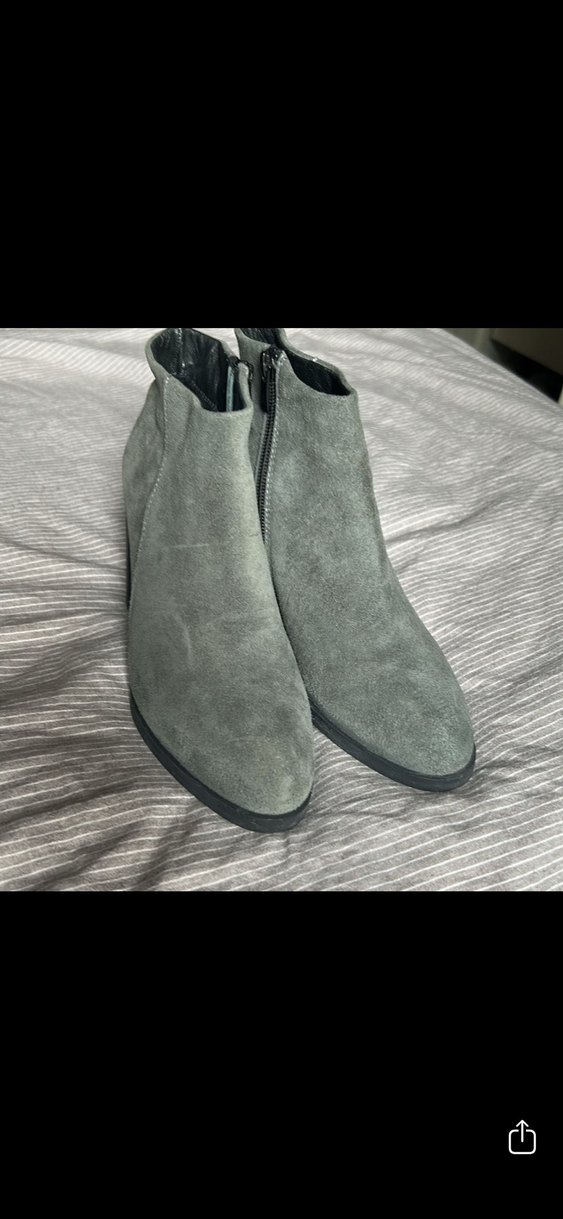 Gri süet kadın bot, dolgu topuklu ve yan fermuarlı, günlük kullanıma uygun sade ve rahat tasarım.