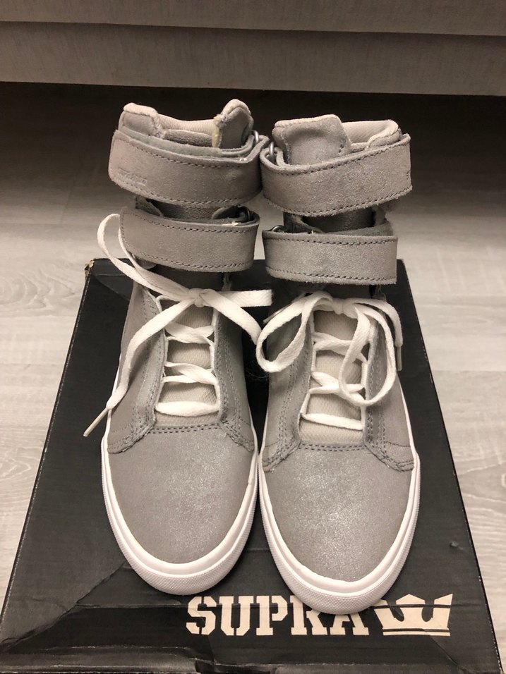 SUPRA markalı gri süet kadın spor ayakkabısı, dolgu topuk ve bağcıklı tasarıma sahip. Sokak stiline uygun, zahmetsiz şıklık sunar.