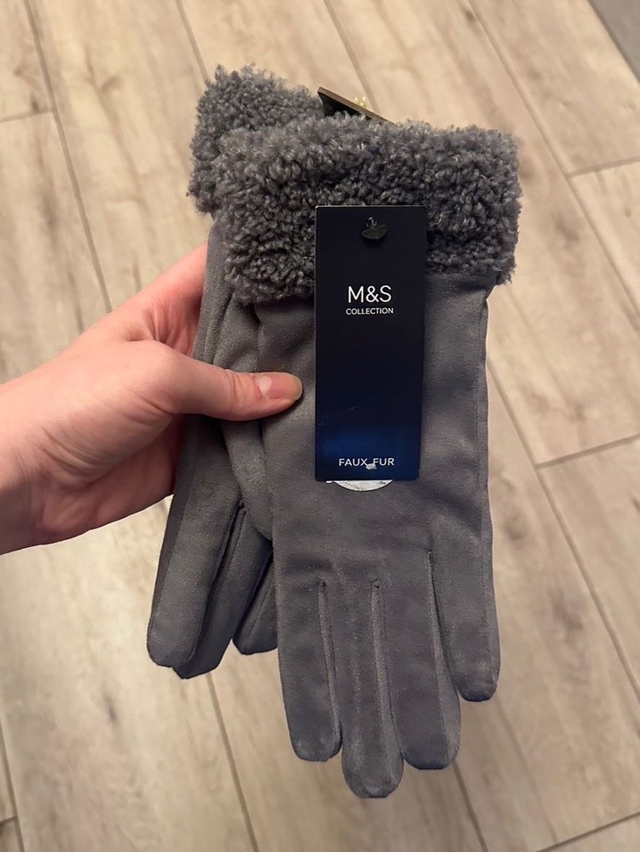 Gri süet kadın eldivenler, manşetlerinde yumuşak sahte kürk detaylarıyla rahatlık ve şık sokak stilini birleştirir. M&S Collection ürünü.