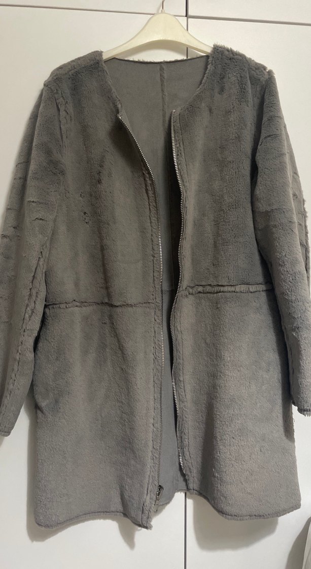 Çift taraflı giyinebilen kürk mont Gri süet kumaştan yapılmış, kürk detaylı, notalı yaka tasarımlı kadın kabanıdır. Rahat kesim, uzun kollu ve midi boydur. Günlük kullanıma uygundur. ❄️çi