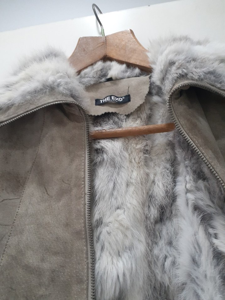 Gri süet kumaştan yapılmış, kürk detaylı, uzun ve bol kesim kadın kışlık ceket. Notch yaka ve sokak stili için uygun.