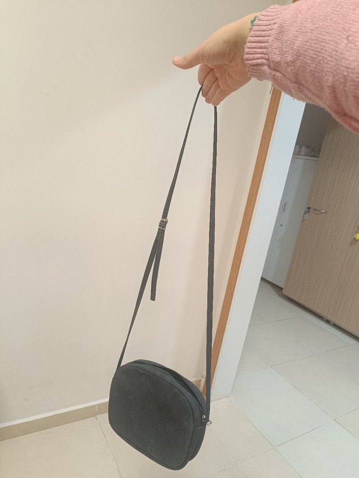 Gri süet malzemeden yapılmış, tokalı ayarlanabilir askıya sahip kadın omuz çantası. Düz ve desensiz yüzeyi, günlük kullanıma uygundur.