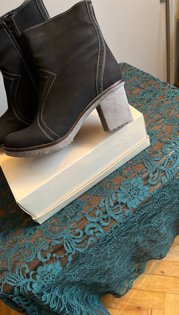 Gri süet malzemeden, blok topuklu ve tokalı, baskılı desenli kadın diz boyu bot. Bohem tarzıyla uyumlu.