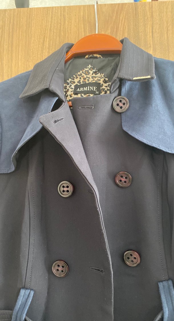 Armine markalı gri süet trençkot, düğmeli ön ve kesik yaka detayına sahiptir. Uzun kollu, normal kesim ve midi boydur. Ofis kullanımı için uygundur.