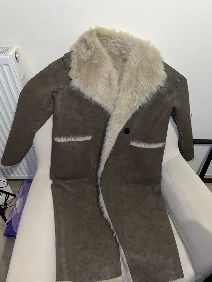 Kadınlar için gri süet, uzun kesim, kürk detaylı, yakası kesik uzun kollu ceket. Rahat kesimi ve sokak modasına uygun tarzıyla günlük kullanım için uygundur. Çift taraflı kullanılabiliyor. Aşırı sıcak tutan bir ürün