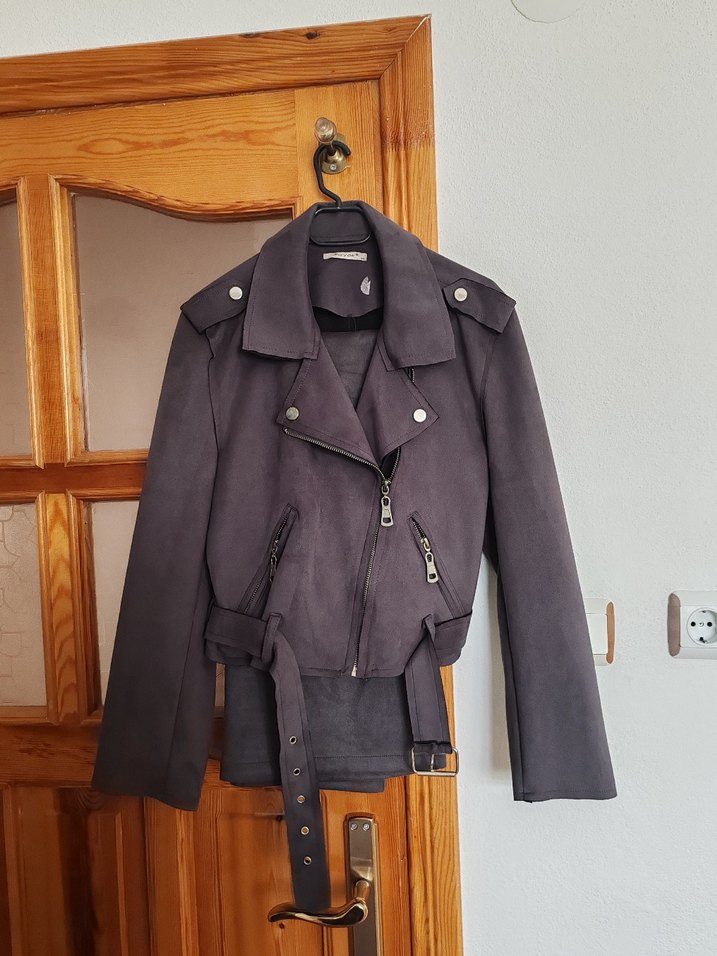Gri süet malzemeden yapılmış, kemerli ve kısa kesimli, notched lapel yakalı, strappy kollu biker tarzı Süet ceket. Trendy ve şık bir görünüm sağlar. Alt takım kalem etekle birlikte iki parça dır