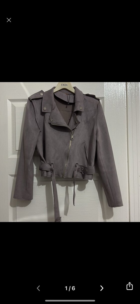Gri süet kumaştan kısa kesim, kemerli, yakası kesik ve kayış detaylı kollara sahip, dar kesim kadın deri ceket.