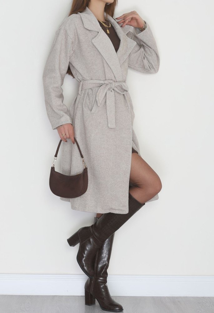 Gri Süet Kemerli Midi Kadın Kaban