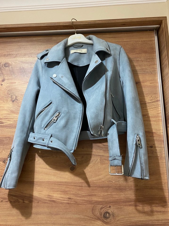 Gri süet malzemeden kısa kesim biker deri ceket, çıtçıtlı yakası, fermuarlı cepleri ve kemer detaylı kayışlarıyla dikkat çekiyor.