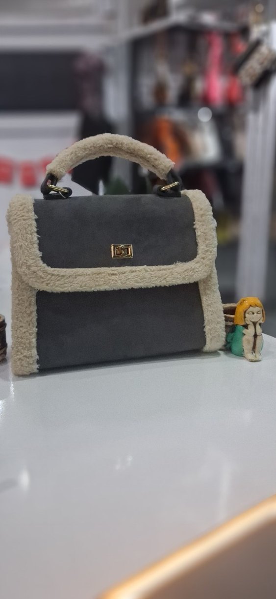 Gri süet malzemeden, kürk detaylı sap ve kenarlarıyla kadın çantası. Rahat ve bohem tarzda, günlük kullanıma uygun.