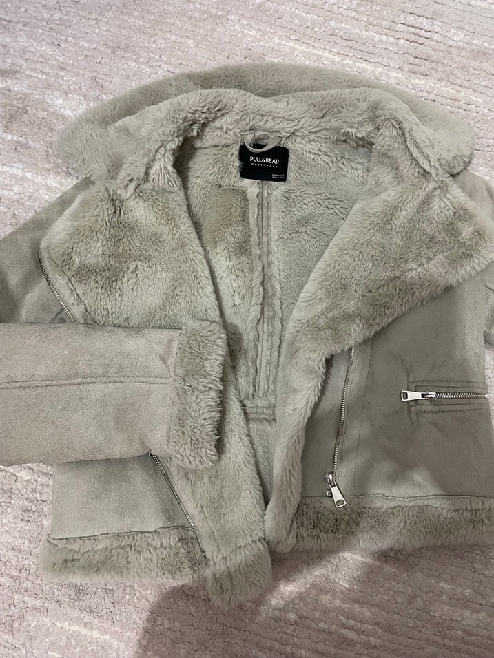Gri süet kumaştan, kürklü detaylı kısa ve dar kesim kadın ceket. Notlu yaka ve uzun kolludur, sokak modasına uygun rahat bir görünüme sahiptir.