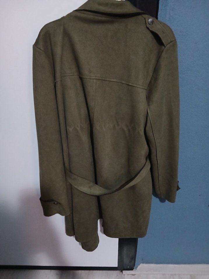Gri süet kumaştan yapılmış, kuşaklı ve kesimli yakalı erkek kabanı. Normal boy ve regular fit, uzun kollu, günlük kullanım için uygun.