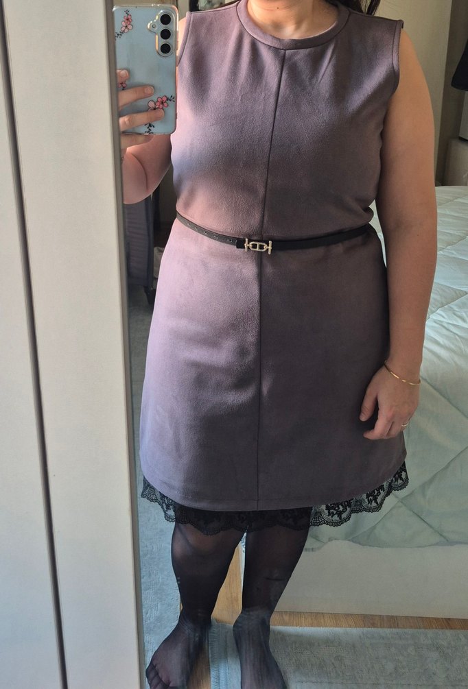 Yumuşak süet kumaştan,yüksek yakalı, gri tonlarda, kolsuz ve dar kesim midi elbisedir. Ofis için uygun, normcore ve şık bir tasarımdır.