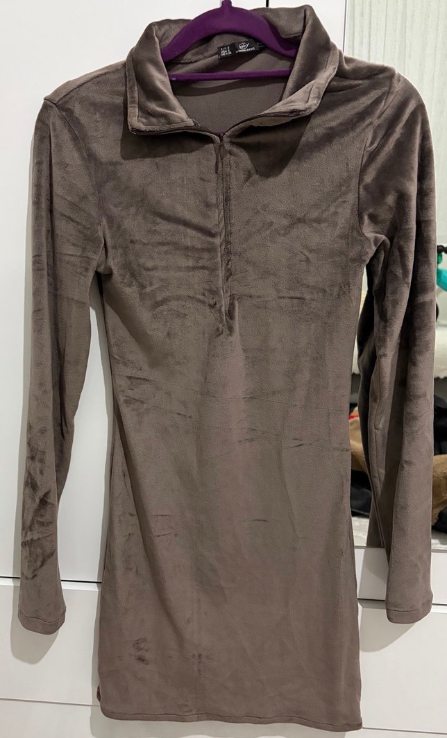 Gri süet görünümlü kumaştan yapılmış, uzun kollu ve yüksek yakalı, fermuarlı fitted midi elbise. Günlük rahat sokak stili için uygundur.
