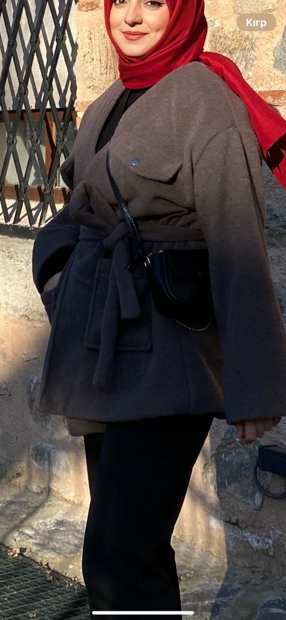 Gri süet kumaştan, kuşaklı ve yakalı, askılı kollu bol kesim midi hamile ceketi. Günlük sokak stili için uygundur.