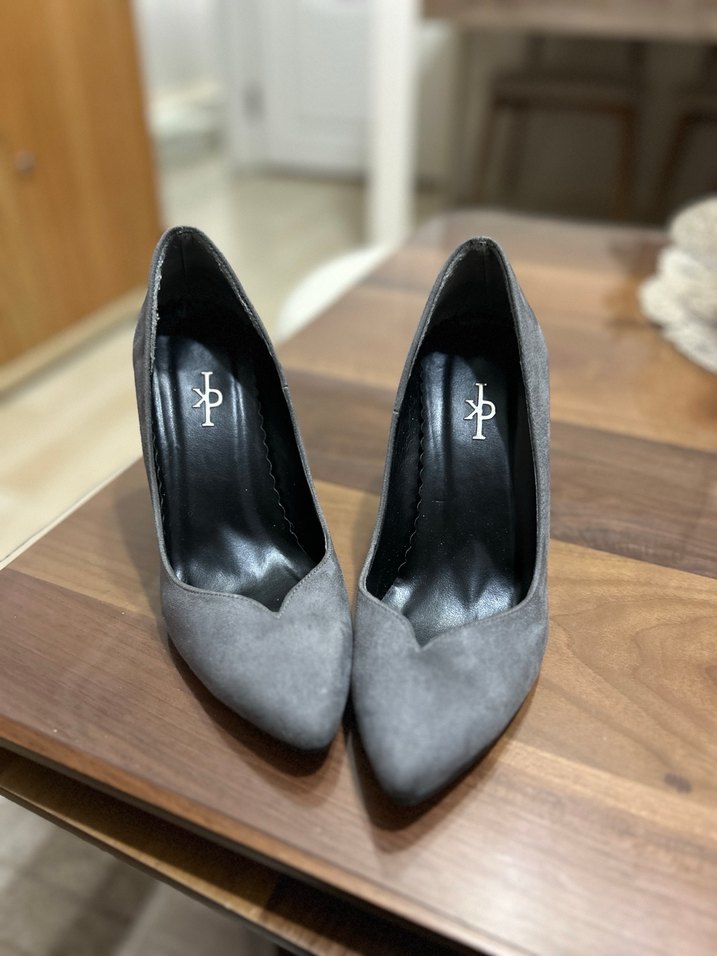Gri süet stiletto topuklu, sivri burunlu ve şık tasarımlı kadın ayakkabısı. Ofis kullanımı için çağdaş ve zahmetsiz şıklık sunar.
