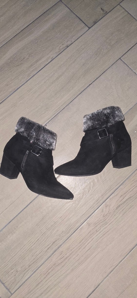 Gri süet malzemeden yapılmış, tüylü detaylı ve blok topuklu kadın botu. Günlük kullanıma uygun, goth tarzını yansıtan şık ve desensiz tasarım. 2,3 kez kullanilmistir