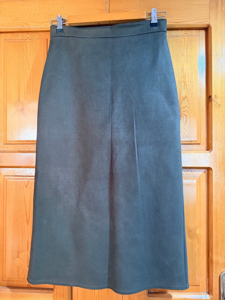 Gri süet kumaştan yapılmış, uzun ve drapeli tasarıma sahip, normal kesim kadın eteği. Minimalist ve normcore tarzda, ofis için uygun.