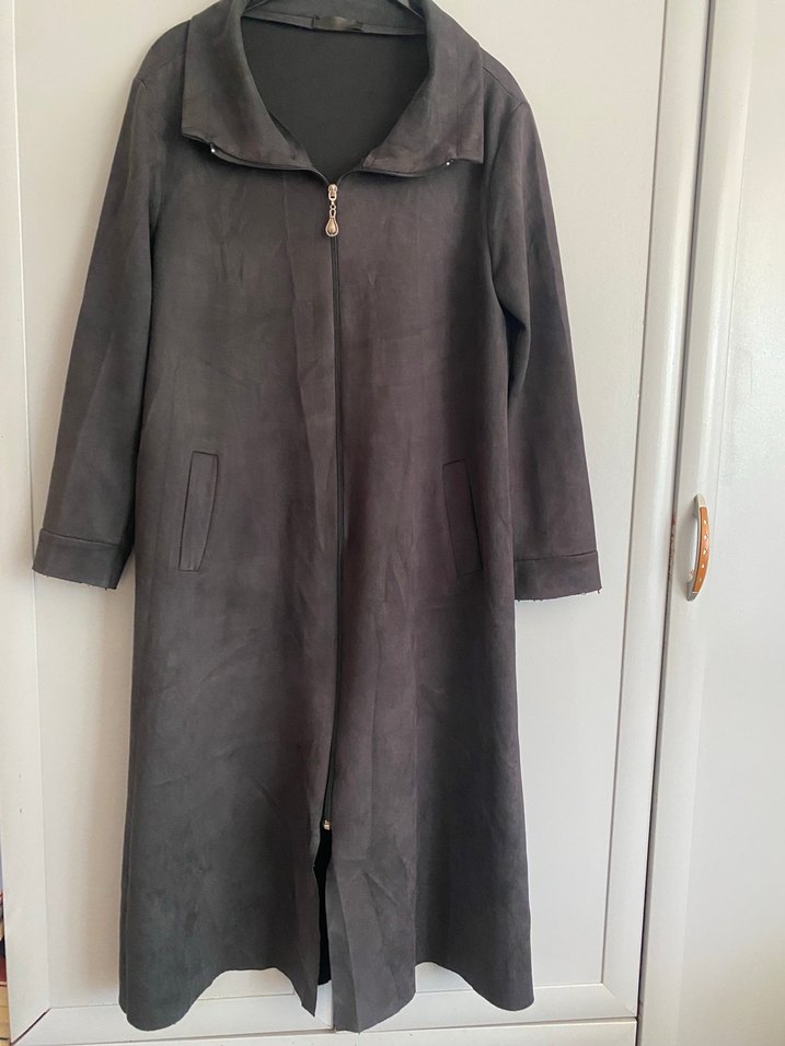 Gri süet kumaştan, uzun ve bol kesim kadın kap. Yakası kesik ve önden fermuarlı. Uzun kollu, iki yan cepli, minimalist ve şık sokak stili