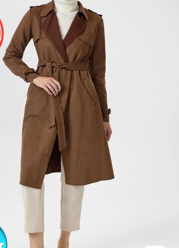 Kahverengi süet kumaştan uzun boy trençkot, yakasında kesik detay ve kemerli bel ile düzenli kesim sunar. Uzun kollu, desensiz tasarımı