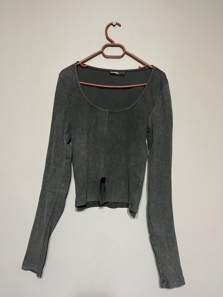 Gri süet kumaştan, uzun kollu ve yuvarlak yakalı, günlük kullanıma uygun şık ve rahat kesim bluz. hiç giyilnedi