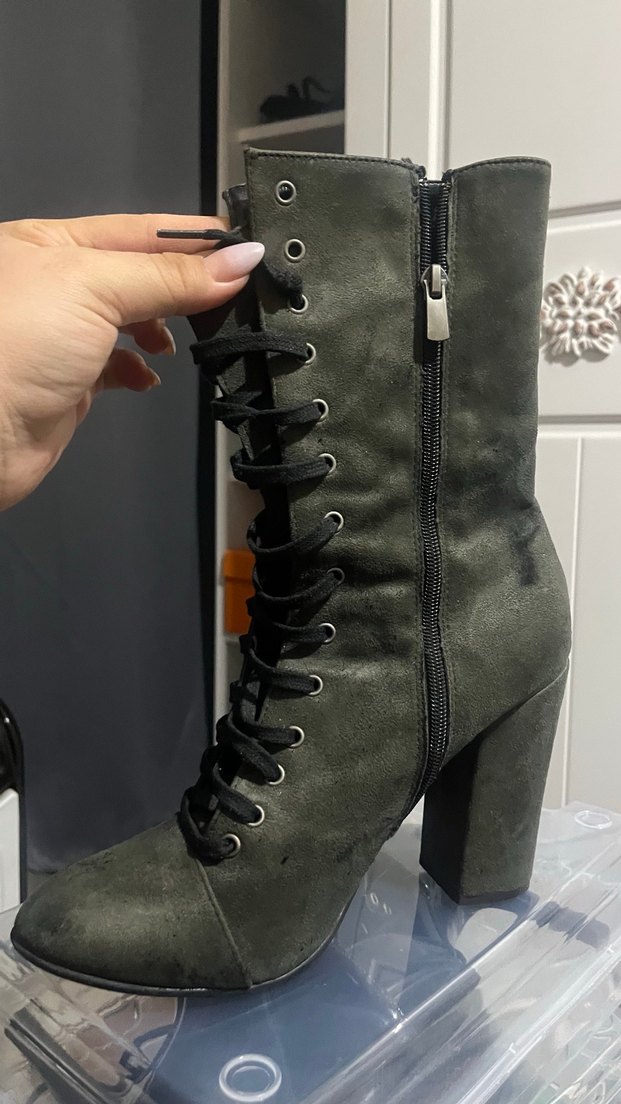 Gri süet, yılan desenli ve topuklu bot. Yanında fermuar ve önünde bağcık detayı bulunan cesur gotik tarzı için uygun. 40 numara ama dar kalıp 38-39 numara da olur