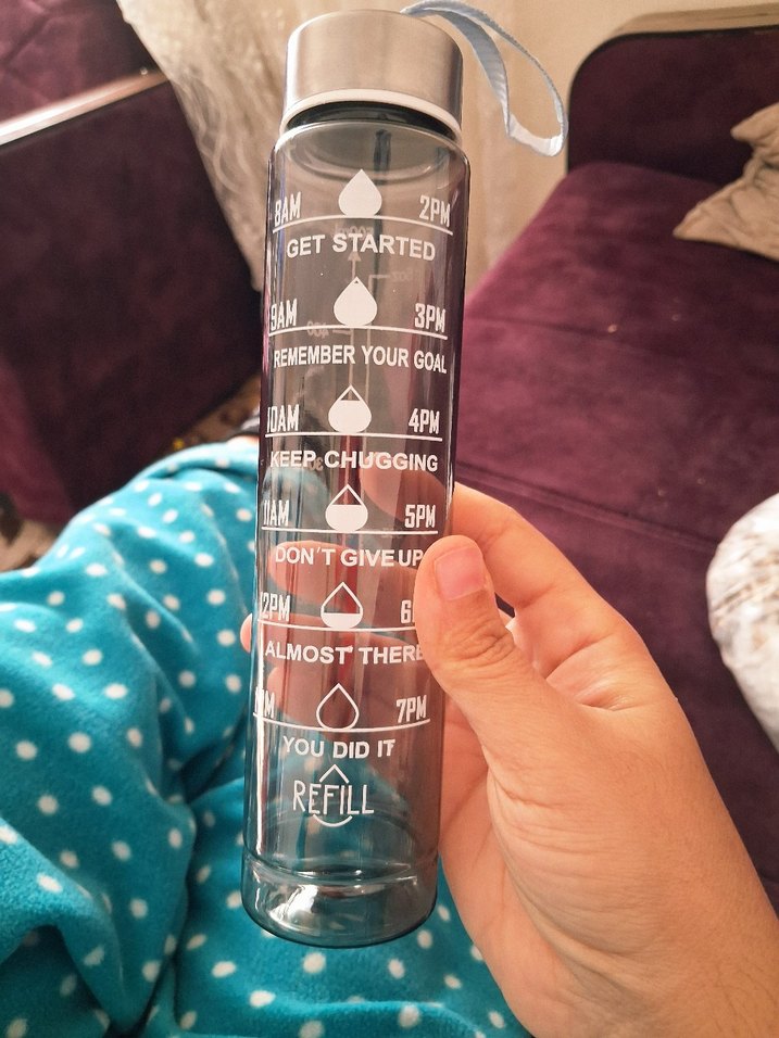 Gri renkte, üzerinde zaman işaretleri ve motive edici yazılar bulunan suluk hiç kullanılmadı