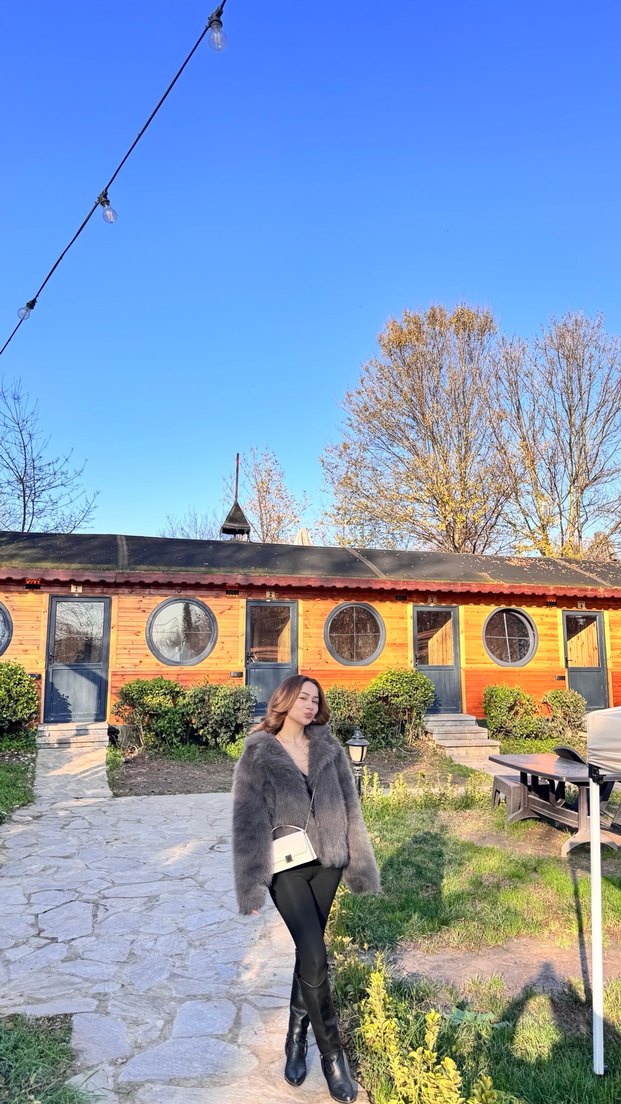 Gri renkli, suni kürk. Uzun kollu, bohem tarzda, rahat kesimli ve boğazlı yakalıdır. Dış mekan kullanımı için uygundur. Sadece 1 kez giyildi hiçbir kusuru yok