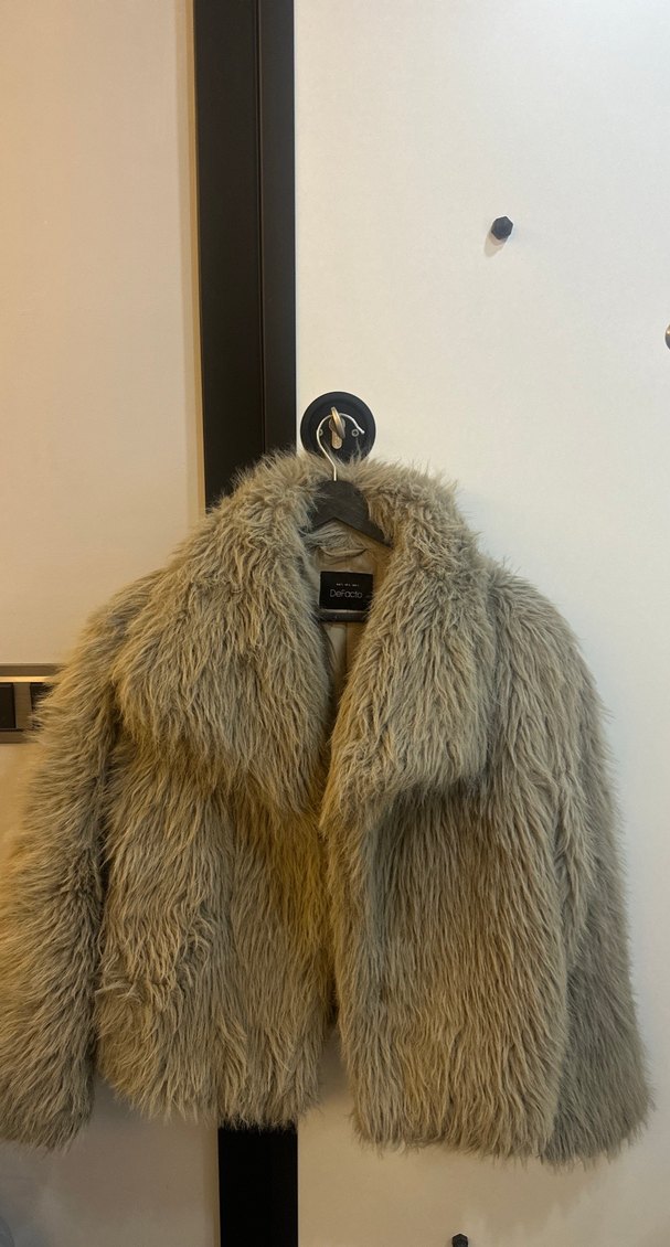 Gri renkte, uzun kollu ve suni kürk detaylı, normal boy midi kaban. Yumuşak dokulu kumaştan, sokak modasına uygun tasarım. L beden ama kalıbı küçük