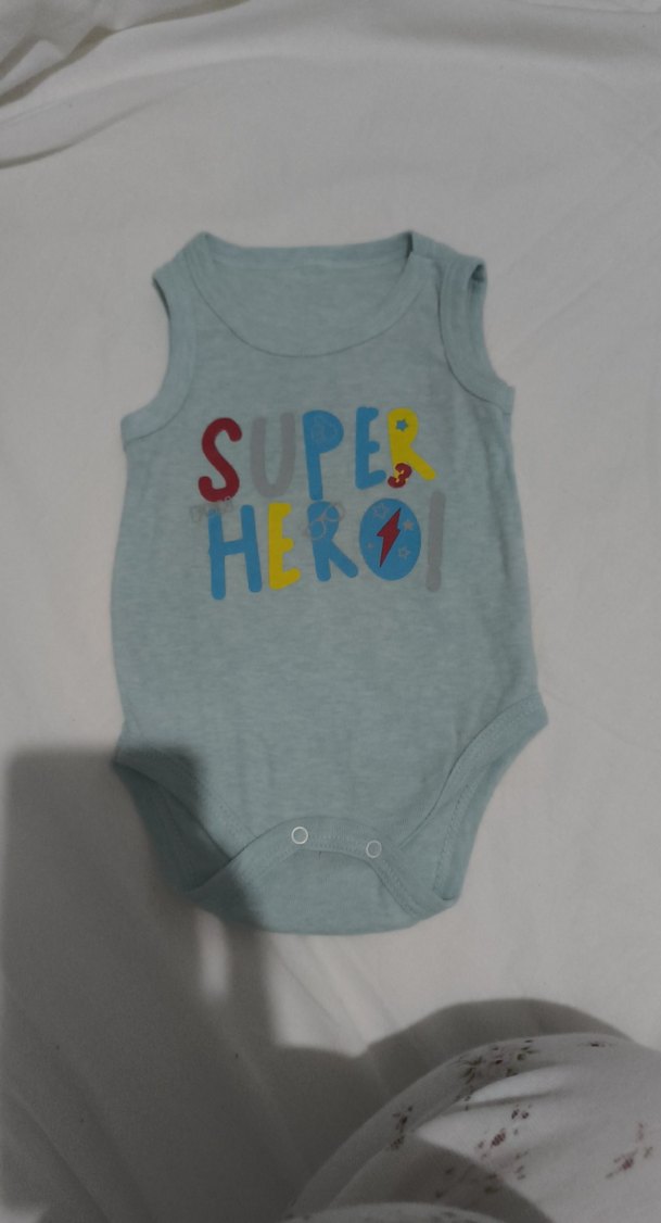 Kolsuz, gri renkte, renkli "SUPER HERO" baskılı ve cırt cırtlı bebek body. Yumuşak sentetik kumaştan, günlük sokak stili için uygundur. ♂️