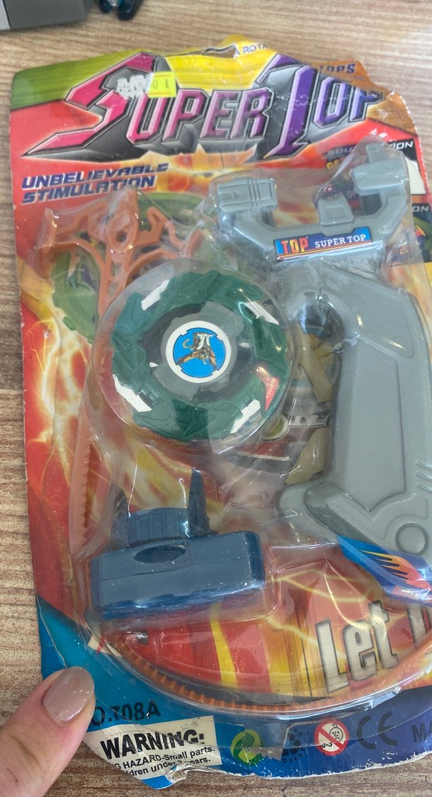 Gri renkte, 'TOP SUPER TOP' yazılı dönen top ve fırlatıcı içeren aksiyon figürü seti. Canlı renkli ambalajda 'UNBELIEVABLE STIMULATION' yazısı bulunur.