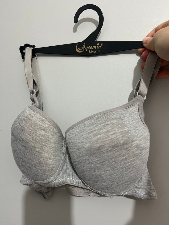 Gri renkte, düz desensiz, spor tarzı ve günlük kullanıma uygun sütyen. Rahat destek ve normal uzunlukta askılara sahiptir. Az kullanıldı.85 bedene uygundur.Yarım desteklidir.