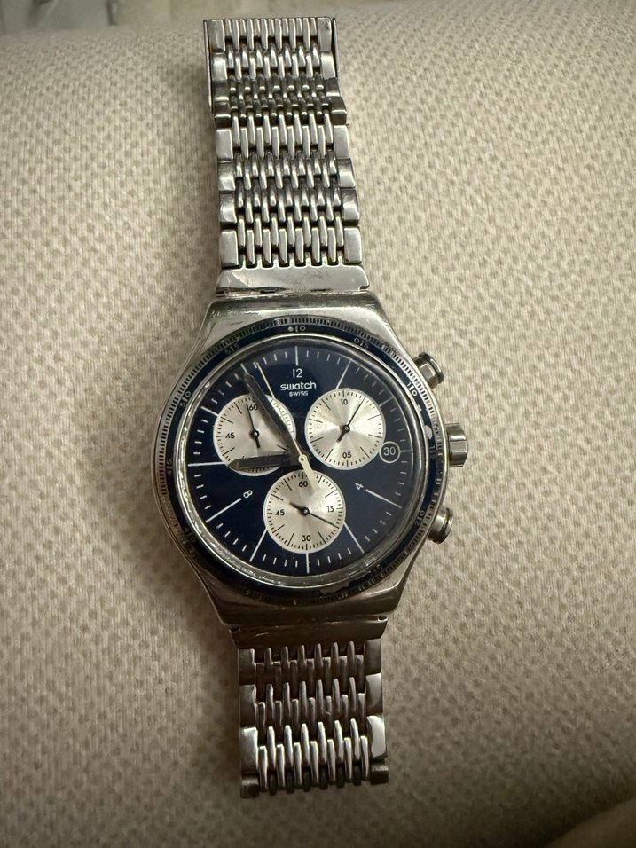 Gri renkte Swatch marka erkek kol saati, klasik tasarımlı metal kordon ve kronograf özelliklerine sahiptir. Kadranda üç alt kadran ve tarih göstergesi bulunur. ⌚