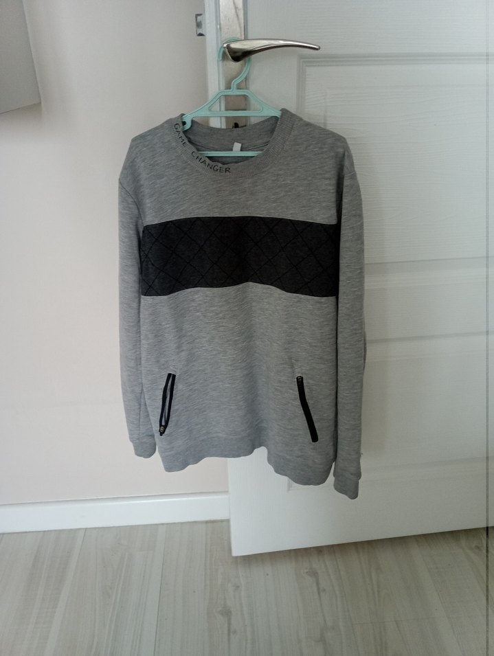 Gri renkte, yuvarlak yakalı, uzun kollu, bol kesim ve normal boyda sweatshirt. Göğüste siyah dokulu şerit ve fermuarlı ceplere sahiptir. içi şardonlu