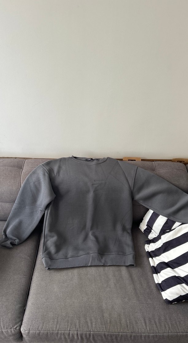 Gri renkli, uzun kollu, yuvarlak yaka ve rahat kesim kadın sweatshirt. Yumuşak sentetik kumaştan, günlük kullanıma uygun şık ve rahat stil. Az kullanılmıştır arka kısmındı küçük bi defo bulunmaktadır