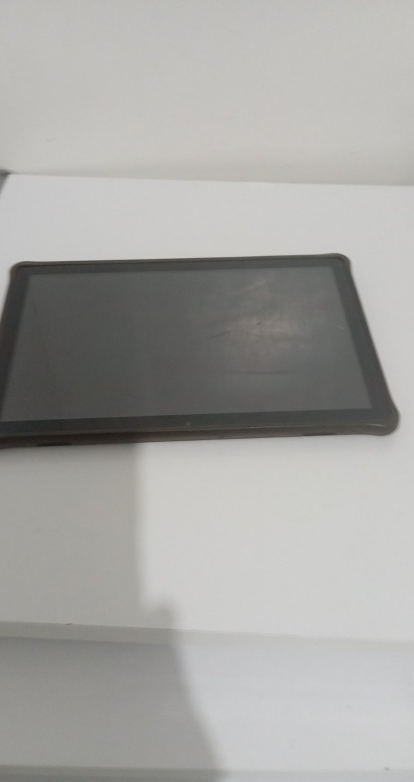 Gri renkte, geniş dokunmatik ekrana sahip tablet. Şık tasarımlı ve koruyucu kılıfla birlikte.