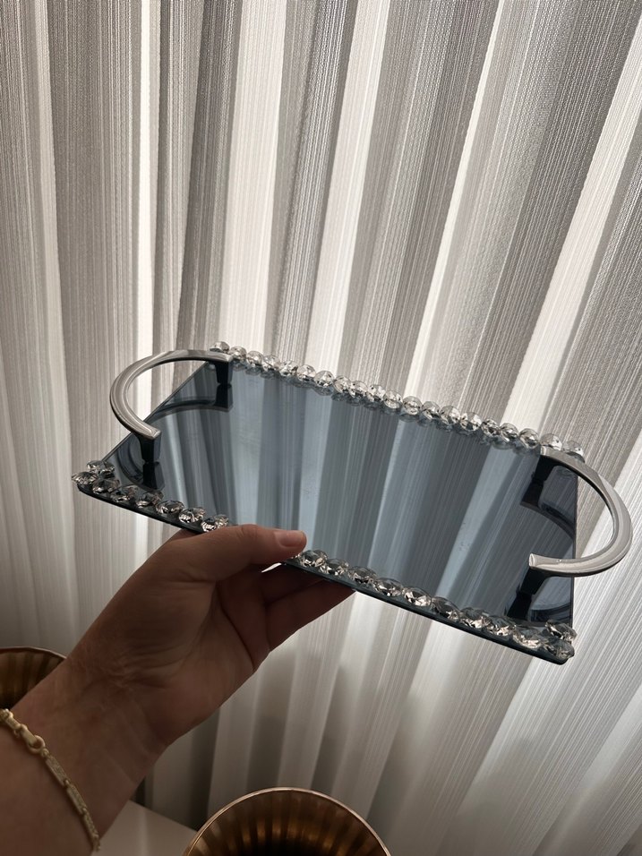 Kenarları taş detaylı gri makyaj organizer tepsi, metal saplıdır ve kozmetik ürünleri düzenlemek için uygundur. Kahve içinde kullana bilirsiniz bir çok yerde