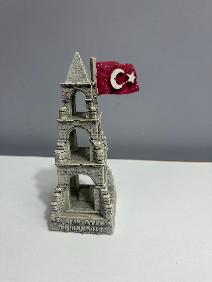 Gri taş malzemeden yapılmış, kemerli kule ve ay yıldızlı Türk bayrağı figürü